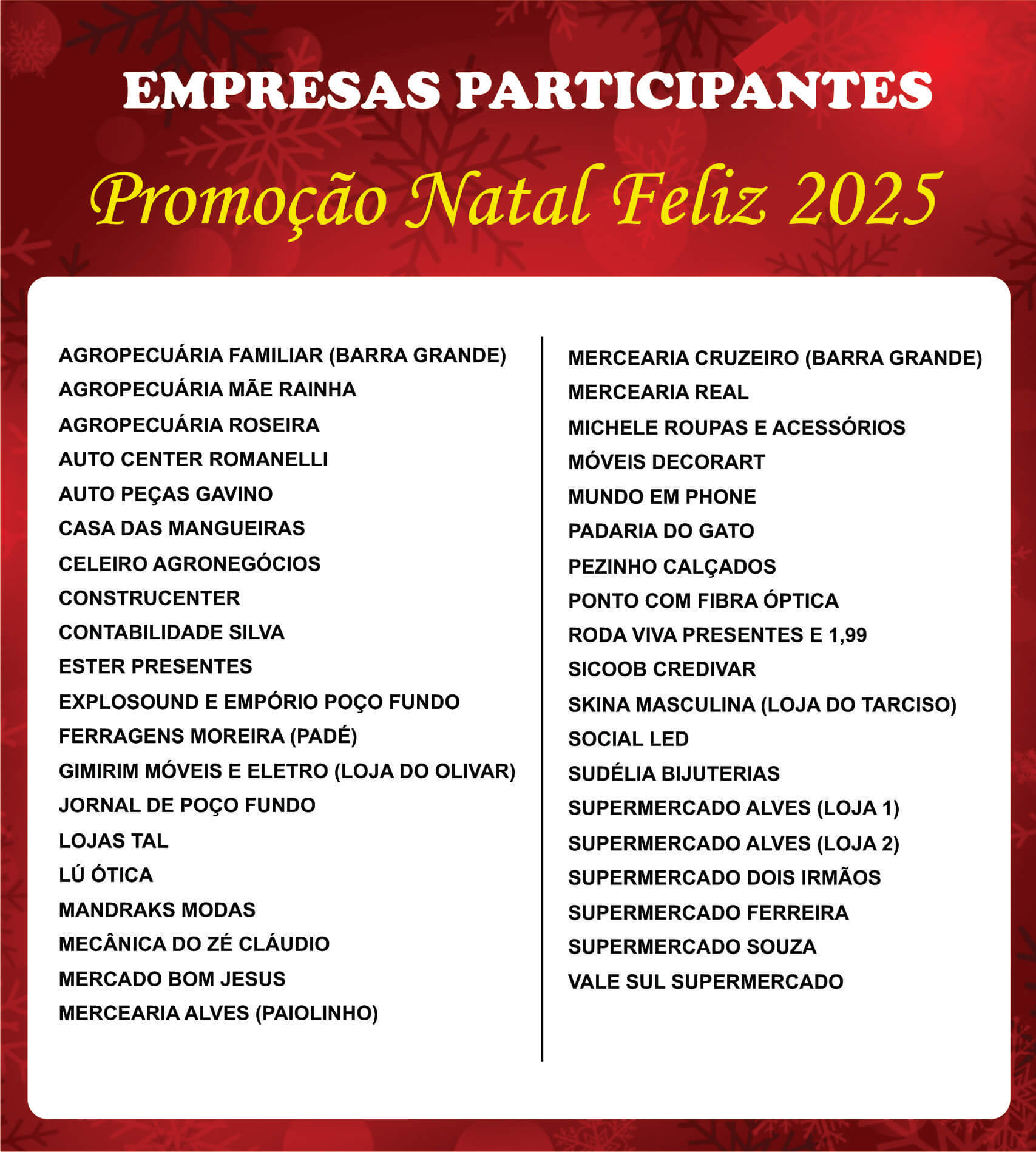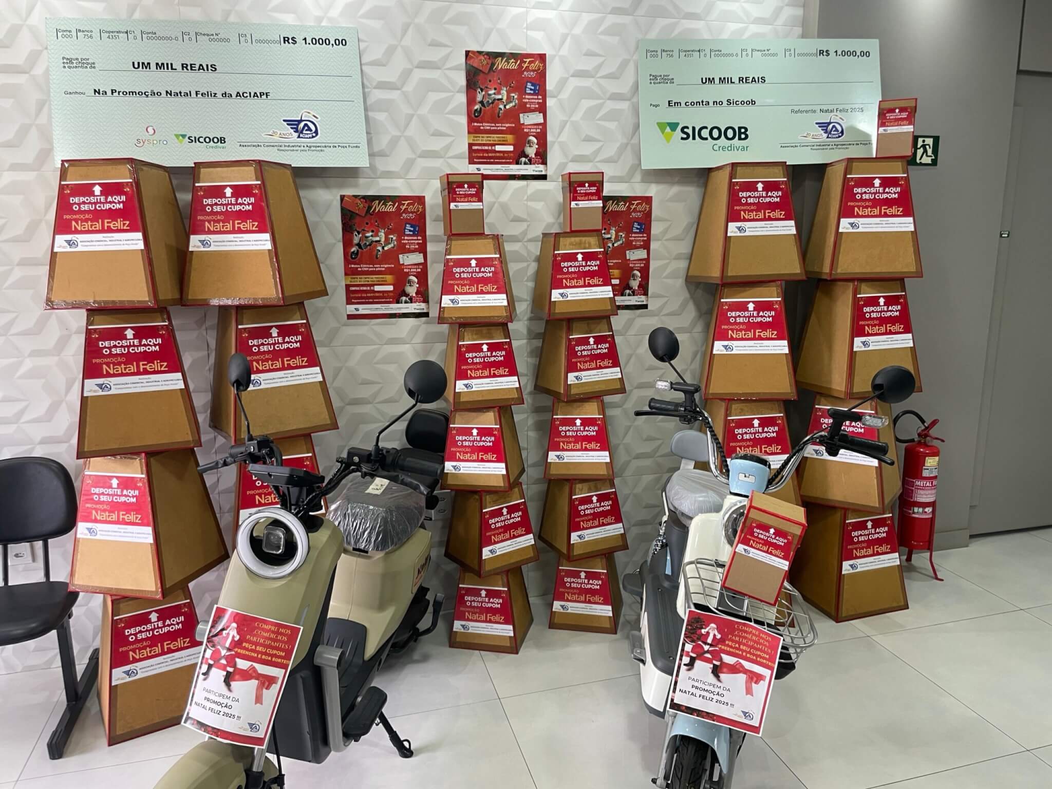 Foi iniciada, no último dia 11 (sábado), a Promoção Natal Feliz 2025, da Aciapf (Associação Comercial, Industrial e Agropecuária de Poço Fundo). A campanha, que possui como principais objetivos o incentivo às vendas de fim de ano na cidade, a valorização do comércio local e a celebração das festividades natalinas, foi aderida por 39 empresas. Todas distribuirão cupons para que os clientes possam concorrer a vários vales-compras nos valores de R$ 250, dois cheques de R$ 1 mil (cada) e duas moto elétricas, que não possuem a obrigatoriedade da CNH (Carteira Nacional de Habilitação) para serem conduzidas no perímetro urbano.