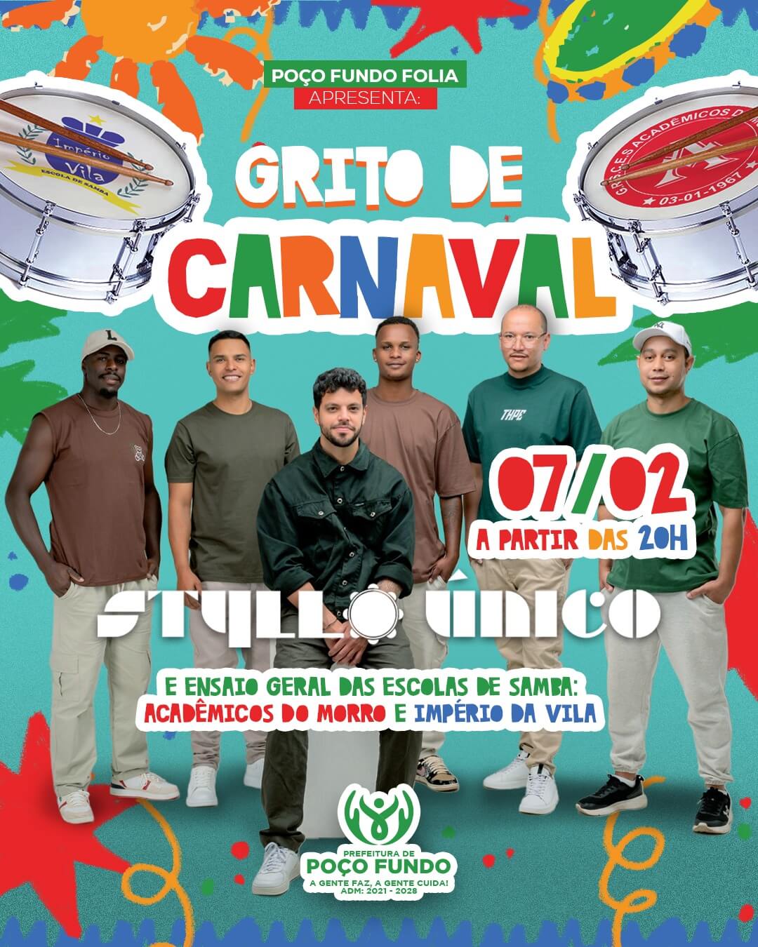 No próximo dia 7 (sábado), as Escolas de Samba Acadêmicos do Morro e Império da Vila darão a tônica do que será o Carnaval 2026 em Poço Fundo, promovido pela Prefeitura, no Espaço Folia, no bairro Nova Gimirim. Convocadas para estrelarem o Grito de Carnaval da cidade, ao lado do grupo de pagode Styllo Único, as agremiações darão uma “palinha” ao público do que levarão para a avenida nos dias 14 (sábado) e 16 (segunda-feira).
